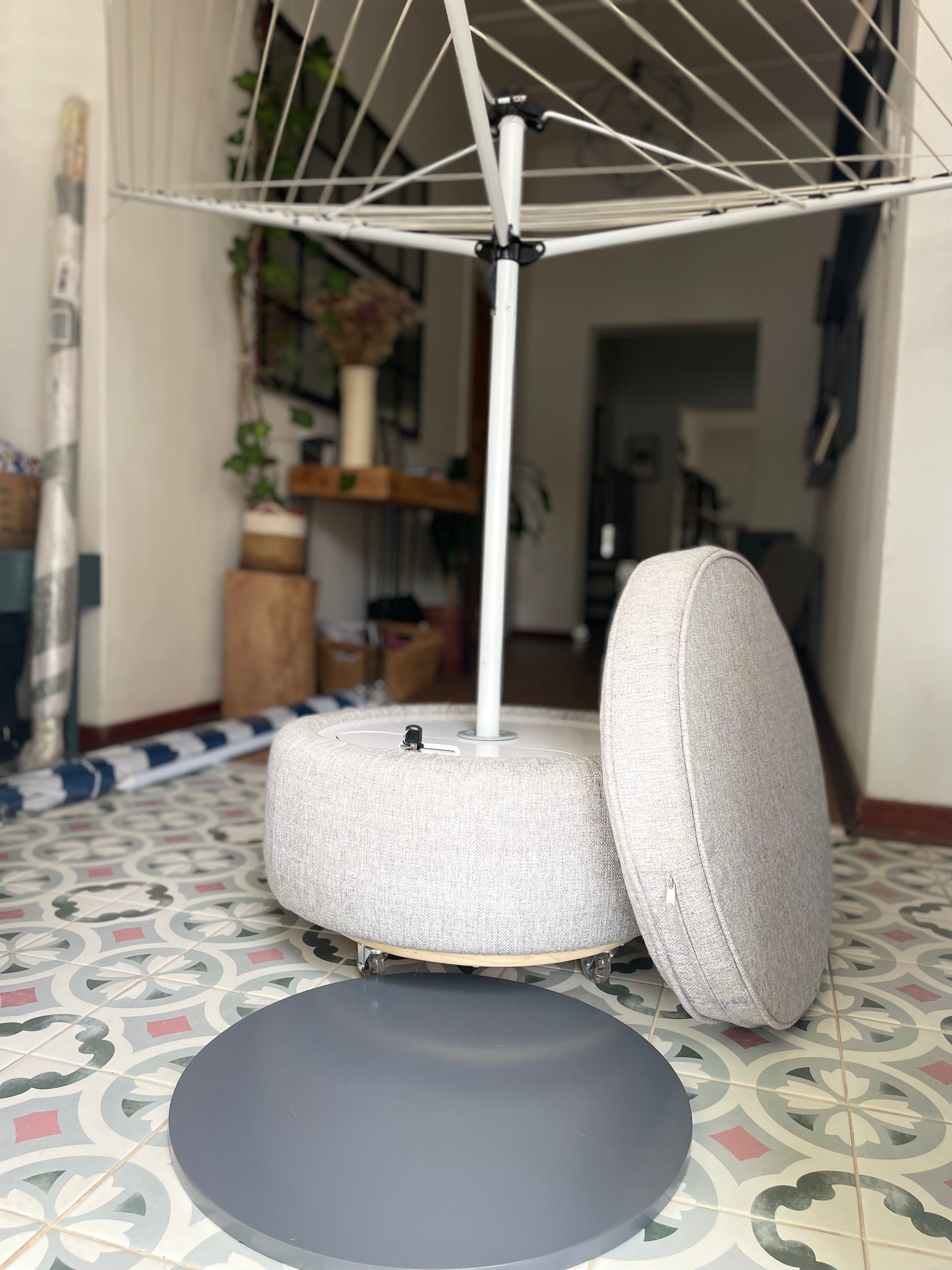 The Otto Kist is the inside version of the Sun Kist. Made from upcycled waste tyres it can be dressed to fit your decor, it is a lockable, moveable safe and serves as an ottoman, stool or table. Remove the cushion and it can be used as a base for your rotating clothes line or even umbrella if you have space on your balcony, stoep or porch.