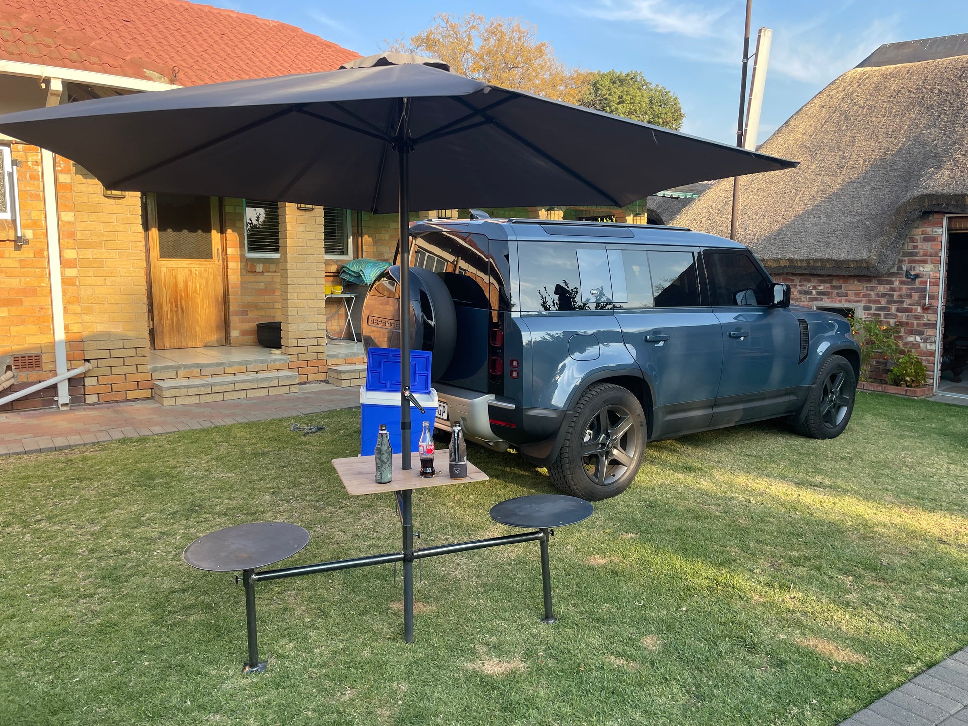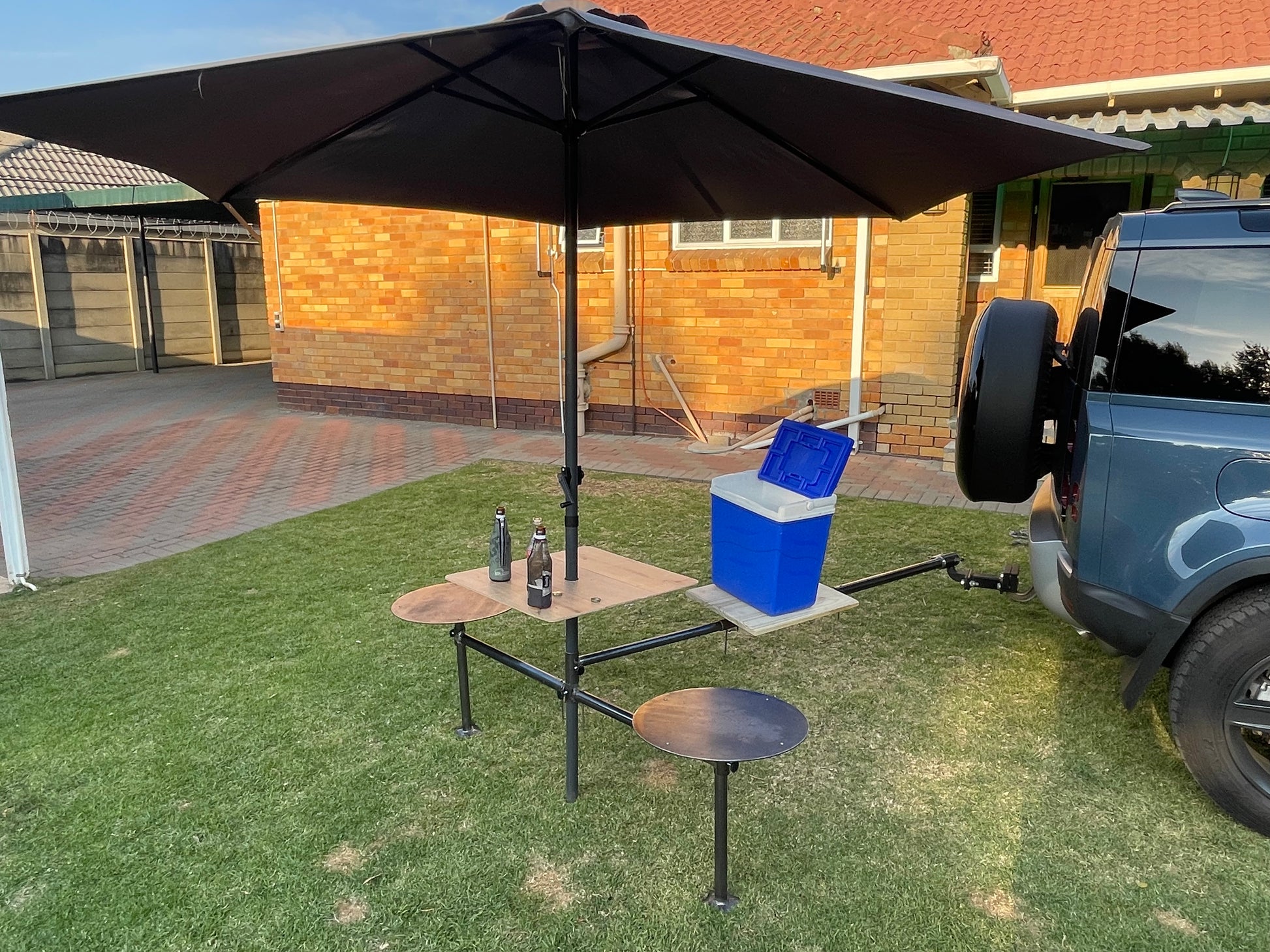 Solid Steel. Measures 600mm when collapsed and extends to 1.5 metres. Attaches to any car's towbar. Set up wherever you park. Accessorise by adding two picnic stools.